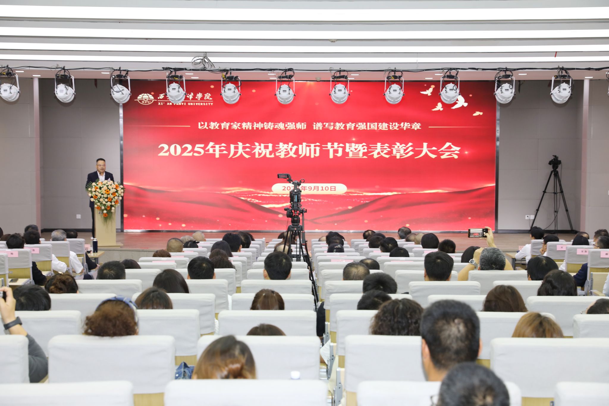 秋兰飘香,师恩难忘。在第41个教师节来临之际,西安翻译学院以“以教育家精神铸魂强师,谱写教育强国建设华章”为主题,开展了一系列形式多样、内涵丰富的庆祝与教育活动。