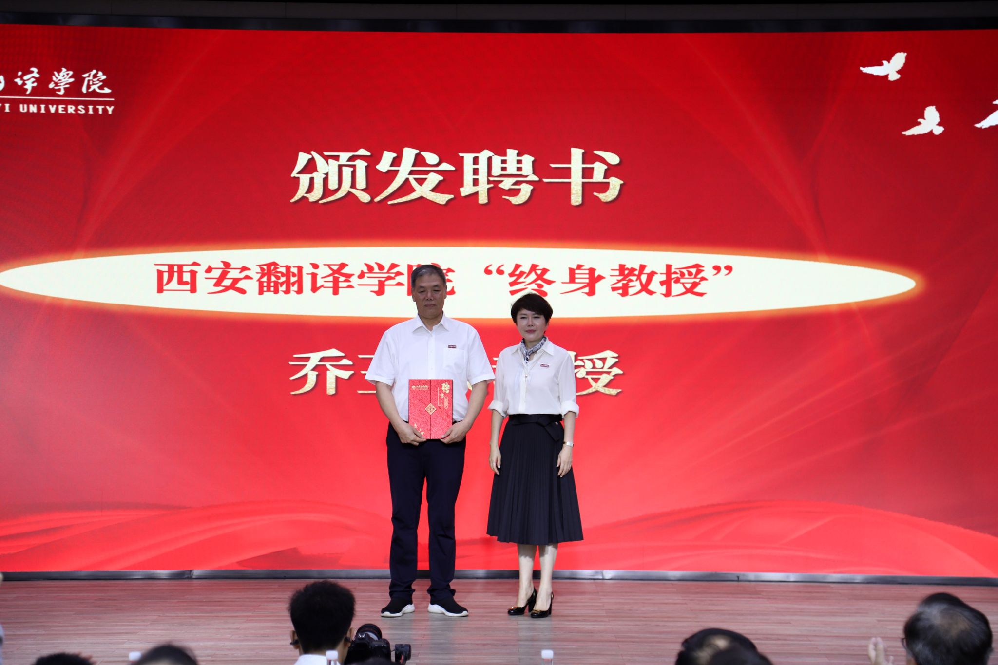 丁晶为乔玉成教授颁发西安翻译学院“终身教授”聘书