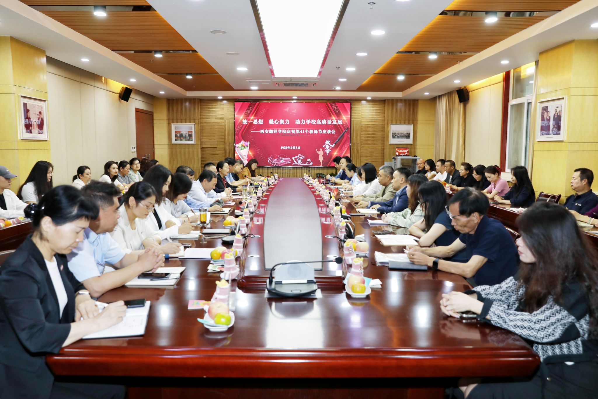 9月8日下午,西安翻译学院召开以“统一思想 凝心聚力 助力学校高质量发展”为主题的庆祝第41个教师节教师座谈会。校长姚书志,党委书记、政府督导专员栾宏,副校长武忠远、王利晓,纪委书记马向阳出席,与50余名教职工代表共聚一堂,共话育人初心,同绘发展新篇。座谈会由党委副书记、工会主席王小惠主持。